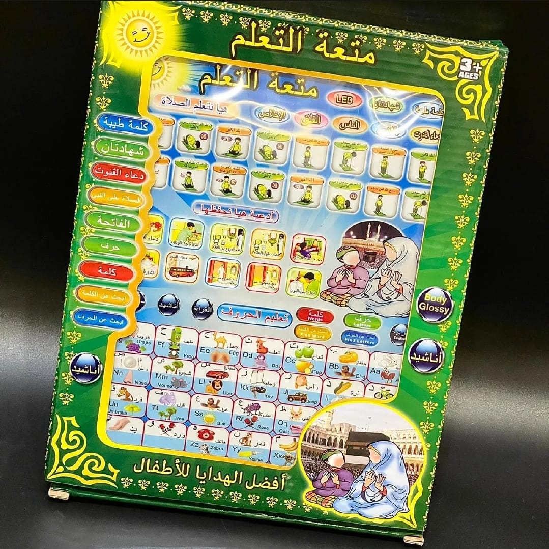 Islamic educational tablet for kids featuring Arabic and English letters. A child-friendly learning toy that builds creativity, motor skills, and hand-eye coordination while making early language learning fun and engaging.